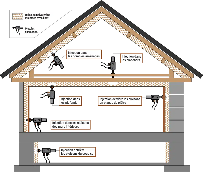Pour accomplir cette technologie, il ne suffit que d’un trou de 25 millimètres percé dans le doublage des parois pour insérer le pistolet d’injection et remplir la paroi de l’isolant ÉCOBILLE ou ISOBILLE. L’injection projette les microbilles de polystyrène agglomérées de liant dans les vides de mur assurant ainsi un remplissage des plus efficace, même dans les interstices de murs de 2 à 3 mm. Injecté sous un jet d’air puissant combiné à la légèreté des microbilles de polystyrène (composé de 98% d’air et seulement 2 %) lui procure toute la fluidité à l’intérieur des murs pour crée un moulage parfait enrobant à la perfection tout ce qui se trouve dans le doublage.